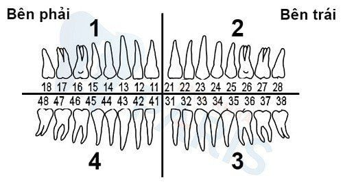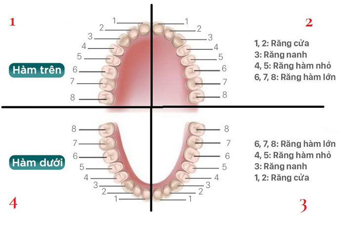 Trong mỗi phần tư, các răng được đánh số từ 1 đến 8 bắt đầu từ răng cửa giữa (răng số 1) đến răng khôn (răng số 8).